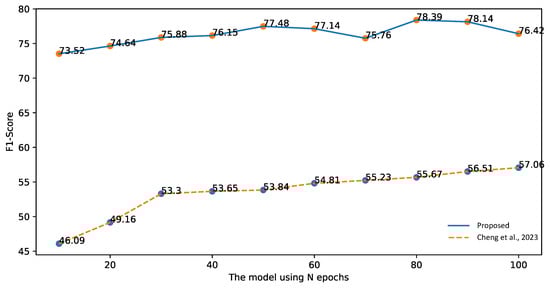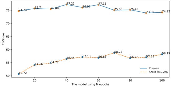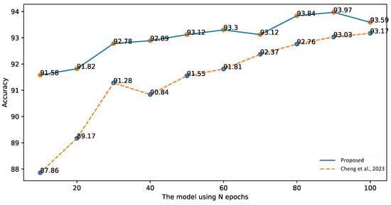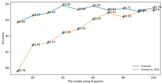 Figure 10 and Figure 11 show the comparison of F1 score and accuracy of the InceptionResNetV2 model architecture by saving the model once every 10 epochs, respectively. As can be seen from the figure, both F1 score and accuracy are better than the TL architecture from the beginning to the end using the SOL architecture. In Figure 10, the F1 score is also more stable using the SOL architecture, and in Figure 11, the benchmark is 93% accuracy. The accuracy of the SOL architecture has stabilized at over 93% after 20 epochs, while the TL architecture must start accuracy at 60 epochs before it has a chance to reach over 93%. The TL architecture takes about 5.57 h to train 60 epochs on average, while the SOL architecture takes about 1.88 h to train 20 epochs on average, which is more than three times faster than the model training time.