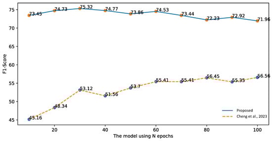 Average F1 score and accuracy comparison of 100 epochs of model testing.