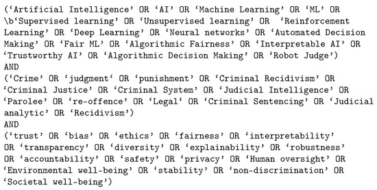 The identification of research started by formulating a search query (Figure 1) based on the research focus, “Ethics and Trustworthiness of AI in Criminal Justice System when Predicting the Risk of Recidivism”. The search query entails three parts: (1) All ML algorithms, including artificial neural networks algorithms; (2) terminologies used in the judiciary system; and (3) The requirements of trustworthy AI based on European Commission and Ethics guidelines for trustworthy AI. The Web of Science was chosen as the research database and was queried based on the formulated query and metadata (Author, Title, Source, and Abstract). Also, IEEE, Springer Nature, Assoc Computing Machinery, Elsevier, Mdpi, Wiley, Sage, and Taylor & Francis were the selected publishers. The research papers were from the year 2010 to mid-year 2023.