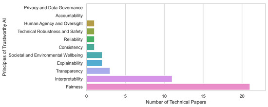Regarding publications, a significant proportion (45 out of 69) were journal articles, 23 were conference papers, and one was a book (see Figure 3). We classified each of the 69 papers as either technical or theoretical. In Section 3, we discuss 33 theoretical papers as related works. Section 6 discusses the 36 technical papers addressing the experimental approach to achieving the ethics and trustworthiness AI requirements when assessing recidivism risk as an extended analysis. The 36 papers were separated and discussed based on the requirements of trustworthy AI they are addressing in Section 6.