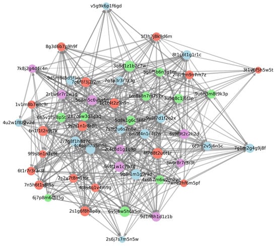 The network model described in Section 3.1 was implemented using the NetworkX package in Python 3, a robust tool for the creation, manipulation, and study of complex networks. Figure 1 shows a visualization of a small sample of the network. Each node of the network is a user who wrote a comment in one of the four subreddits considered. Two nodes are linked by an edge if one user has replied to the other user in a comment. Nodes are colored according to the corresponding user subreddit’s membership. As shown in Figure 1, the overall network related to body shaming on Reddit is highly connected, with many nodes and edges. There are several distinct communities within the network, which are identified using different colors. Some communities are more densely connected than others, indicating that certain groups of users are particularly active in discussions related to body shaming.