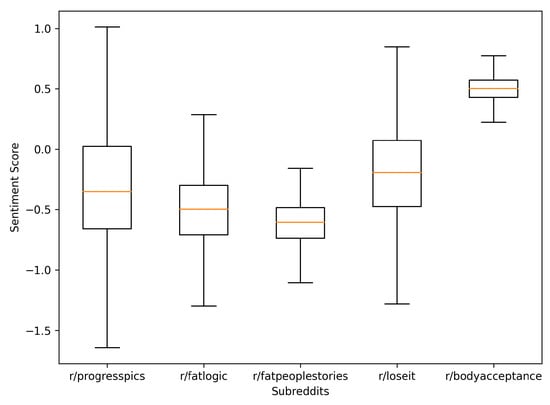 Moreover, the sentiment of language used in comments varies significantly across different communities. Figure 4 shows a boxplot of sentiment scores of comments made by users in each of the five communities within the network. As shown in the figure, users in the r/bodyacceptance subreddit had significantly higher mean sentiment scores than users in other communities, indicating a more positive and supportive tone in discussions related to body image and weight. Conversely, users in the r/fatlogic and r/fatpeoplestories subreddits had significantly lower mean sentiment scores, indicating a more negative and shaming tone in discussions related to body shaming.