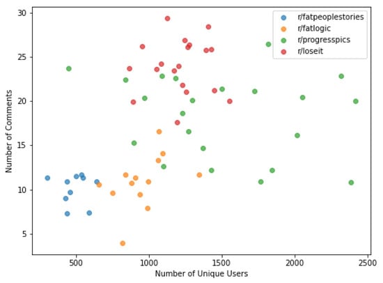 To further understand the differences in patterns of behavior and communication across subreddits or communities related to body shaming on Reddit, some additional analyses were conducted beyond those presented in the previous sections. Figure 5 shows a scatter plot of user activity in each subreddit. This plot presents the distribution of the number of comments against the number of unique users. Each point in the plot is a group of users who made the same number of comments. For example, in the subreddit r/fatlogic there are around 1000 unique users who wrote near 8 comments each. That is a point in the scatter plot. For a better visualization, the outliers have been avoided, taking only users with an activity near average values. As shown in the figure, there is considerable variation in user activity across subreddits or communities related to body shaming on Reddit. For example, r/progresspics has the highest number of unique users who made comments, while r/fatpeoplestories has the fewest. Additionally, there is a wide range in the number of comments made by individual users.