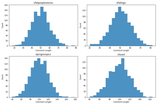 An additional plot made is the distribution of comment length in each subreddit to examine the differences on how much users write across subreddits related to body shaming. Figure 6 shows the histograms of comment length in each subreddit. As shown in the figure, comments in r/fatlogic and r/fatpeoplestories tend to be shorter, with a peak at around 50 words. Comments in r/progresspics and r/loseit tend to be longer, with a peak at around 100 and 115 words, respectively.