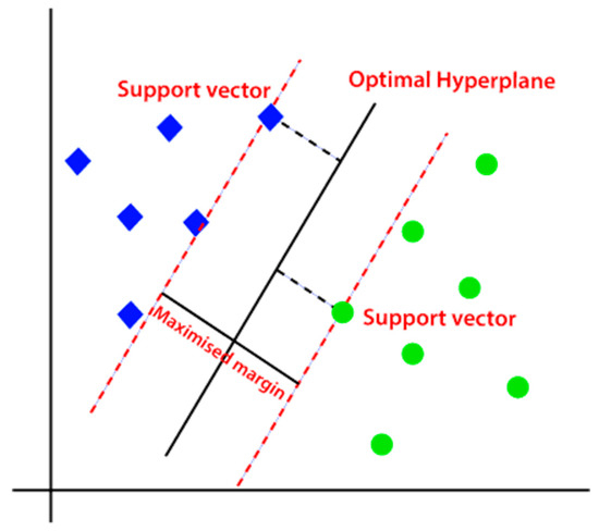 Nowadays, most researchers are using Support Vector Machine, which is a supervised learning technique, and it is mostly used for addressing classification as well as regression problems. However, it uses machine learning classifications. SVM approaches new data to build the best line, which later can split n-dimensional space into a finite number of classes, which can be called a hyperplane. SVM generally chooses extreme vectors and respective points, which makes a hyperplane and so these types of extreme situations can be detected by using support vectors. Figure 1 describes two different categories that are classified by using a hyperplane.
