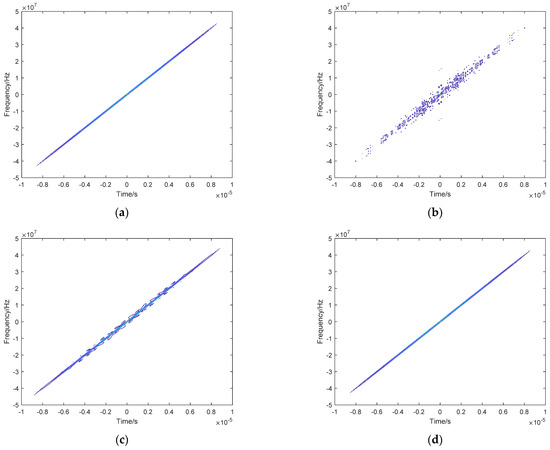 An ideal radar signal’s ambiguity function is in the shape of a thumbtack; the top view of the ambiguity function is a point on the plane. The ideal radar signal does not exist in practice; however, as shown in Figure 2a, the LFM signal is an excellent radar signal: Its ambiguity function has an oblique blade shape, and the top view of the ambiguity function is an oblique line. As shown in Figure 2b, after adding data, the ambiguity function diffuses, which affects the radar detection performance. From an analysis of the literature [21], it can be seen that the phase shift of the communication causes the diffusion of the ambiguity function. As the phase shift decreases, the diffusion effect decreases. Therefore, as shown in Figure 2c, the sub−LFM−BPSK modulation method with a small phase shift is adopted to improve the radar’s performance. We expect the integrated signal designed based on the LFM radar waveform to have ambiguity function characteristics similar to those of the LFM waveform, and we expect it to preserve the radar’s characteristics while realizing communication as much as possible. The single-antenna waveform with spread spectrum code processing has excellent ambiguity function characteristics when used in a MIMO system. As shown in Figure 2d, after the spread spectrum processing of the integrated signal, the top view of its ambiguity function is similar to Figure 2a. At the same time, the MIMO system realizes the orthogonal waveform of each antenna and constructs the omnidirectional waveform of MIMO radar communication integration.