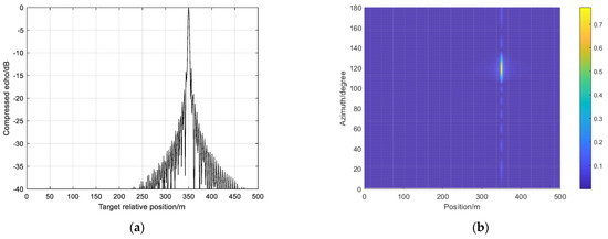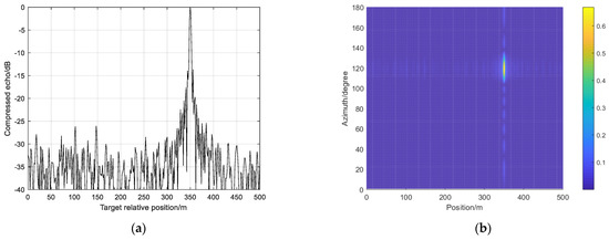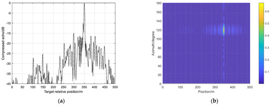 As shown in Figure 5, the range performance of the integrated sub−LFM−BPSK waveform was significantly improved compared with that in Figure 4, and as shown in Figure 5a, the pulse compression signal of the echo was reduced in its side lobes. As shown in Figure 5b, we can discriminate the position and angle of the target.
