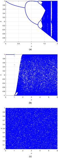 where is the bifurcation parameter, and only when , the Logistic map falls into the chaotic state. The bifurcation diagram of the Logistic map is shown in Figure 1a.