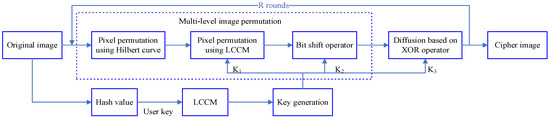 To enhance the security of encryption algorithms, this paper proposes an image encryption algorithm based on an improved Logistic–Chebyshev chaotic map (as shown in Figure 3). It consists of three phases, viz. the key generation phase, multi-level permutation phase, and image diffusion phase.