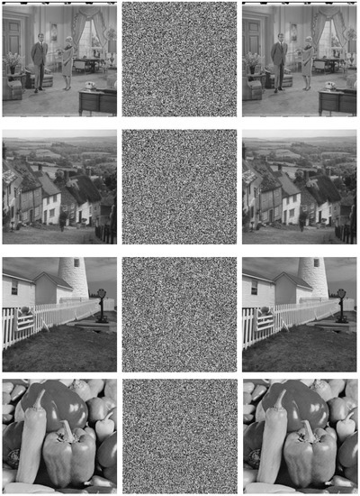 Some examples of image encryption. (left) column: Plaintext image, (center) column: ciphertext image, and (right) column: decipher image.