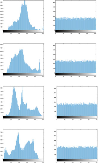 Histograms of plaintext images (Left) and ciphertext images (Right). Up to down: couple, Goldhill, lighthouse, and peppers.