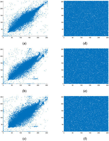 Take the ‘couple’ image as an example; Figure 6 illustrates the distributions of the correlation of a plaintext image and ciphertext image in the three directions. The results of the correlation coefficients of the original images and encrypted images are shown in Table 2. It can be seen that from Table 2, the values of the plaintext images nearer to 1 mean a high adjacent pixel correlation, while that of the ciphertext images nearer to 0 indicates a low correlation. So, the proposed scheme shows good resistance against attacks.