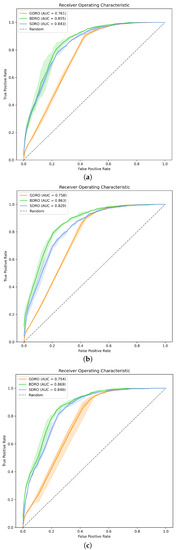 AUCROC curves for all the proposed DROs. (a) DROs with BERT embeddings, (b) DROs with BERT mini embeddings, and (c) DROs with clinical BERT embeddings.