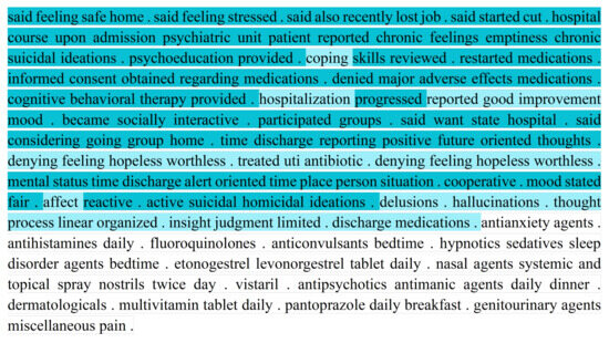 Figure 3 shows that BDRO is attending to patient-reported outcomes (e.g., “chronic feelings emptiness chronic suicidal ideations”) and clinicians reported outcomes (e.g., “mental status time discharge alert oriented time place person situation”). In general, the model assigns high weights to sentences indicative of severe impairment (e.g., “active suicidal homicidal ideations”) and low weights to sentences that show moderate impairment (e.g., “denying feeling hopeless worthless”). The latter example also illustrates the importance of context (i.e., “denying”) for the correct classification of the medical notes.