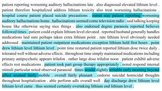 Attention weights produced by BDRO for a section of a medical note in the medical record of a bipolar patient with moderate impairment.