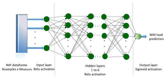 In this study, a DNN architecture was developed to predict WM load using EEG signals. Figure 5 shows the architecture of the DNN model used in this study. The model consisted of six hidden layers, a Relu activation input layer, and a Sigmoid activation output layer. The model was trained using the backpropagation algorithm with the Adam optimizer and a categorical cross-entropy loss function. The model’s performance was evaluated using Overall Accuracy (OA), specificity, sensitivity, F1 score, and Kappa metrics. In this study, the IMFs were used as features for predicting WM load using a DNN model.