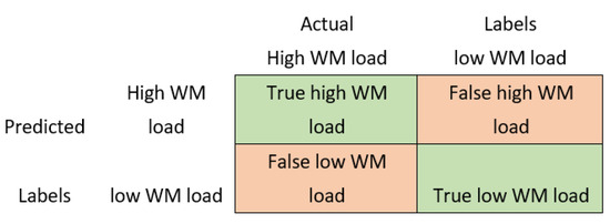 A total of 18 subjects participated in the experiment. Each subject filled out the participant consent form before the commencement of the session. Each subject’s response on the block tapping and N-back WM tasks were recorded to calculate low and high WM load for the three trials, while the 16-channel EEG data were also recorded. The EEG data were preprocessed as per the workflow in Figure 2. The IMF features were divided into training, testing, and validation sets before training the DNN. For each trial, a confusion matrix was computed to discern between two classes: Low WM load and high WM load. The format of the confusion matrix is shown in Figure 6. The performance metrics were calculated using the formulas given in Table 1, where TH is True High WM load, TL is True Low WM load, FH is False High WM load, and FL is False Low WM load.