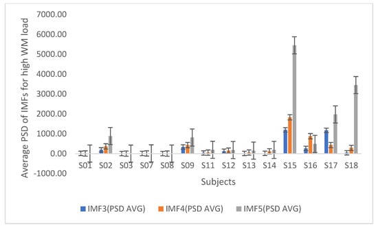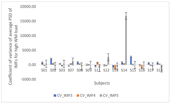 The EEMD was used for extracting time-frequency features called IMFs from the EEG signals. The efficacy of the IMFs in distinguishing between low WM load and high WM load was analyzed by calculating the average of the Power Spectral Density (PSD) of the IMF3, IMF4, and IMF5 for the frontal Fp2 electrode EEG signal. The Fp2 was selected as this was one of the best channels selected by the ICA method for 17 of the 18 subjects tested. The brain processes memory information in the frontal region of the brain. The average PSD of the IMFs 3, 4, and 5 during the rest state (the subject was seated with eyes closed) for subjects above 60 years and subjects with MCI are depicted in Figure 8, and the coefficient of variance in Figure 9, respectively. According to Figure 8, the AVG PSD of IMF is high for subjects S16 and S17 with MCI. In the case of subjects of age above 60 years, only the AVG PSD of IMF5 has higher values which are the lower frequencies of the ensemble empirical mode decomposition, while the MCI subjects have higher values of the AVG PSD for IMF4 that are of higher frequencies of beta waves. Figure 9 depicts a graphical representation of the coefficient of variance, showing a high value for subject S12 for IMF4, indicating a high oscillatory behavior.