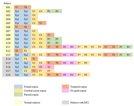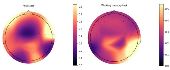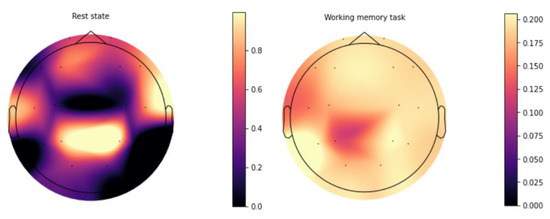 ICA was used to identify the most independent EEG channel electrodes based on orthogonal rotation of prewhitened EEG 16 channel data, through a fixed-point iteration scheme, that maximizes a measure of non-Gaussianity of the rotated components. The number of channels identified were from 2 to 10 out of the total 16 channels. Figure 14 gives the name of the electrodes selected for each subject and the brain region they pertain to. It can be seen that the frontal region is the most involved in WM tasks for all the subjects where the channel electrodes Fp1 and Fp2 are located. In two normal subjects, channels F3, F4, F7, and F8 in the frontal region were also selected. Following the frontal region electrodes, the electrodes in the cerebral cortex region C3 and C4, and the temporal electrodes T5 and T6 were the most selected. Hence, the frontal, cerebral cortex, and temporal electrodes were selected for all subjects. In addition, the parietal electrodes P3 and P4 were selected for some normal subjects, while the occipital electrodes O1 and O2 were selected instead of the parietal electrodes in three subjects with MCI. Figure 15 and Figure 16 show the brain topological plot for a subject from each tested group during a rest state and during a WM task state. As seen in the left panel of Figure 16, the subjects with MCI exhibited mostly zero values in the brain topoplot during the rest state.