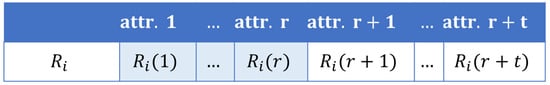 The following model omits the existence of Direct Identifiers and just deals with one QI and several SAs. Furthermore, to make the setting comprehensible, we use the terms table, database, and dataset interchangeably. Let be a database modeled as a multiset with not necessarily distinct records, where , are database entries composed of attribute values; is the number of attributes that are part of the QI; is the number of non QI attributes; , is the set of possible attribute values of the attribute indexed by j; and the first r attributes represent the QI. In the following, let denote the cardinality of a set, and more specifically, let denote the number of distinct records in database D. As several records can potentially be assigned to one individual, n records correspond to individuals with QI attributes , where . We assume that given data are preprocessed and individuals can only be assigned to one individual, i.e., . Further, let denote the SAs as a subset of all attributes. For the sake of simplicity, in the article, without loss of generality, we restrict the numerical attributes to and the categorical attributes to , . Let denote the i-th entry and denote the value of the j-th attribute of the i-th entry in the database. Figure 1 visualizes the data structure to be studied.