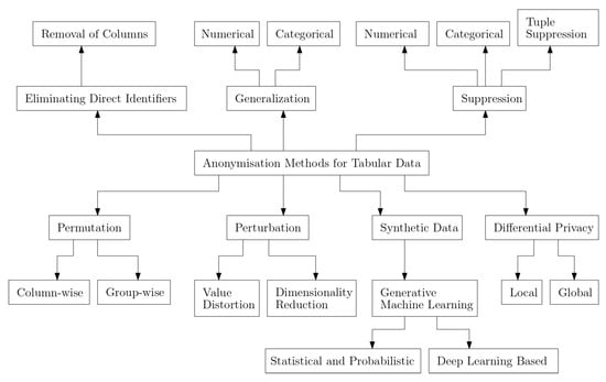 Before scoring certain levels of anonymity for a dataset with personal data, we give an overview of common anonymization methods. We aim to cover relevant methods for tabular data in as detailed a manner as necessary. We are aware that not all methods are described in detail and that research is being carried out on newer approaches. However, in this article, we focus on the most important methods that are state-of-the-art and/or common practice. Some anonymization methods use the information given by the QI. In that case, it is important to note that there might be more than one QI (super key) in a database, and often, several choices of QI have to be considered to score anonymization. For the sake of simplicity and because the following definitions do not limit the use of multiple QIs, where needed, we use a fixed set of attributes as a single QI. In the following, we categorize anonymization methods in seven categories (Section 4.1, Section 4.2, Section 4.3, Section 4.4, Section 4.5, Section 4.6 and Section 4.7), where not all are necessarily based on QIs. The considered methods are given in the taxonomy in Figure 2. This taxonomy represents a hierarchical structure that classifies anonymization methods into different levels of categories and subcategories, reflecting their relationships.