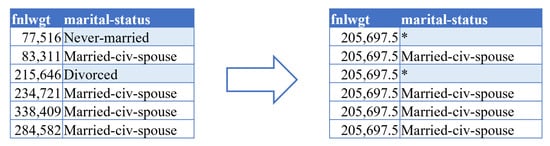 Suppression (or Data Masking) can be defined as a special type of generalization [18]. To be specific, suppression using generalization resp. total generalization can be achieved by applying for every database record , where or , when suppressing categorical attribute values. To suppress numerical attribute values, we can define with , where f is a statistical function such as mean, sum, variance, standard deviation, median, mode, min, and max. An example of suppression is given in Figure 4.