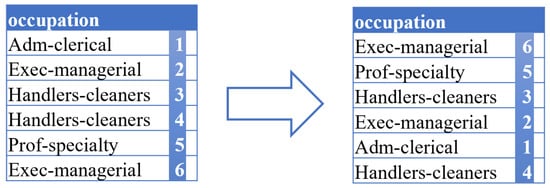 Example. Visualizing permutation of the column occupation in the cutout of the first six rows in the Adult dataset. The attached indices point out the change in order by applying permutation. No attribute values are deleted, but the ordering inside the column is very likely destroyed.