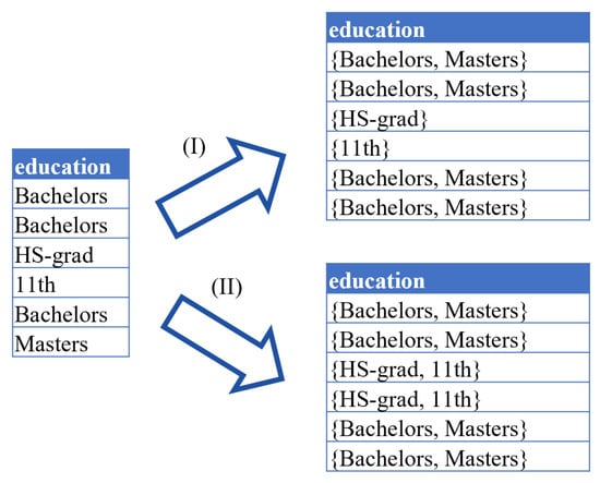 If , is no generalization at all, i.e., , we have , and there is no uncertainty. On the other hand, if , there is maximal uncertainty. An example of entropy information loss is given in Figure 6.