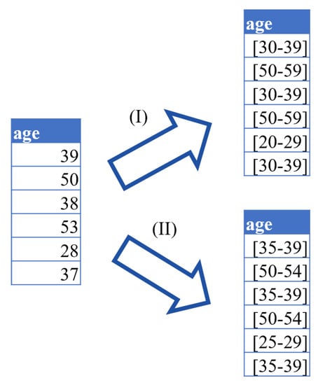 where I has length L and represents the floor function, which rounds down to the nearest integer. If one wants to discretize to tenths or even smaller decimal places, one can multiply L and the attribute values in the corresponding column with before applying discretization and with the multiplicative inverse of after applying discretization. In practice, due to the often vast possibilities of generalizing tabular data, a generalization strategy has to be found. Note that data consisting of categorical and numerical attributes can incorporate different generalizations for different attributes and different database entries (Equations (2)–(6)).