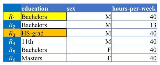 We only consider data that have string or atomic data types, e.g., Boolean, integer, character, and float, as attribute data types. From a conceptual point of view, we only distinguish between categorical and numerical attributes, which can be reduced to the data types of string and float in implementations. Characters and integers might be typecast, respectively. We define records as single entries in the database. Individuals might be related to more than one record. This happens when records are created by user events, such as purchase records. Though we relate to relational databases and their taxonomy, to emphasize the anonymization task, instead of using the term “primary key”, we use the term Direct Identifier. Instead of talking about a “super key”, we say Quasi-Identifier (QI). A QI refers to a set of attributes where the attributes are not identifiers by themselves, but together as a whole might enable the unique identification of records in a database. The QI denotes the characteristics on which linking can be enforced [2]. The QI contains the attributes that are likely to appear in other known datasets, and in the context of privacy models, there is the assumption that a data holder can identify attributes in their private data that may also appear in external information and thus can accurately identify the QI [3]. Further, by considering the same attribute values of a QI, the dataset of records is split into disjunct subsets that form equivalence classes. In the following, we call these equivalence classes groups. If a group consists of entries, we call the group a k-group. Besides Direct Identifiers and (potentially more than one) QIs, there are the so-called Sensitive Attributes (SAs), which, importantly, should not be assignable to individuals after applying anonymization. In Section 4, we give the mathematical setting for the data to study. In contrast to pseudonymization, where re-identification is possible but is not within the scope of this article, anonymization does not allow Direct Identifiers at all. For this reason, in anonymization, removing Direct Identifiers is always the first step to take (e.g., in [4]). For the sake of simplicity, we assume that this step is already performed and define the data model on top of it. For the sake of consistency and comparability, throughout the article, we use the Adult dataset from the UCI Machine Learning Repository [5] (“Census income” dataset) for visualizing examples.