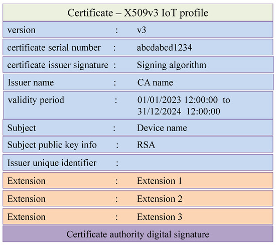 An X.509 certificate is a digital certificate that uses the public key infrastructure (PKI) standard and contains an additional extension field to be used in the certificate. The digital certificate is a safeguard against various attacks. It enables IoT devices and servers to exchange information securely. X.509 v3 contains several additional fields, such as the device’s unique identification string, serial number, the public part of a secret key, issuer name, validity period, signature, etc. The digital certificate X.509 profile is depicted in Figure 3.