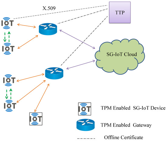 An effective mutual authentication procedure is required for trusted communication between smart grid IoT devices. Digital certificates are electronic files that prove the authenticity of devices or servers using device identity, the public key, and a cryptographic key. The certificate authority (CA) signs the digital certificate, and all entities trust the CA. In addition to evidence verification using a digital certificate, remote attestation would check the integrity of the IoT software state and would also detect any change. In the remote attestation mechanism, the state of the software or memory proof of untrusted devices is exchanged with the server or another device for verification. RA mechanisms rely on Trusted Platform Modules (TPMs) to generate attestation proofs. The TPM protocol can provide security to manufacturers of IoT devices and service providers, as well as more confidence in certificate-based authentication processes for IoT devices containing a TPM [9]. A TPM wallet security protocol based on blockchain was proposed by reference [10] and can provide security for IoT devices.