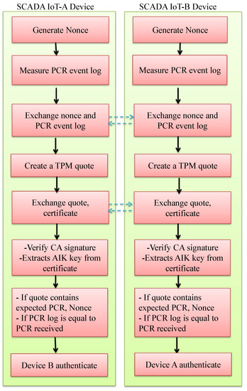 The previously exchanged nonce is included in this signature to avoid a replay attack. During this phase, quotes are exchanged and verified. This is done according to the Trusted Computing Group (TCG) protocol [33]. The step-by-step attestation procedure is shown in Figure 5.