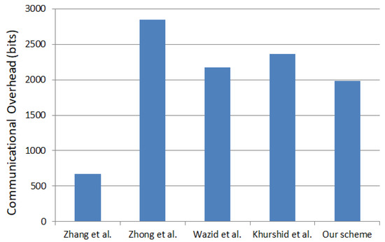 This subsection compares our scheme’s computational cost with those in references [18,19,22,25]. To achieve authentication, scheme [18] will cost 6 Te + 3 Th = 23.75 s. Scheme [19] will cost 2 Tbp + 3 Th = 84.48 s. Similarly, scheme [22] will cost 12 Tem + 23 Th = 56.26 s and scheme [25] will cost 4 Trn + 6 Te + 6 Td + 2 Th = 37.78 s, respectively.