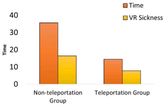 Relationship between time and VR sickness level felt by non-teleportation and teleportation groups [7].