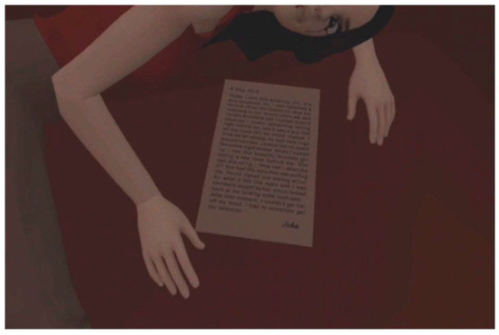 Each page of the diary features a date, followed by a text written by John, and ends with his signature. In total, the game contains six pages that the player can find in the following rooms: (1) one page in the living room, (2) two pages in the bedroom, and (3) three pages in the office. The objective of this game element is to convey the narrative to the player in a way that is engaging and arouses curiosity about what happened. The open-ended nature of the narrative, especially in the diary pages, is intended to pique the player’s curiosity, allowing them to form their own perception of John and Mary’s story. The player gradually obtains the pages as they progress through the game, but it is only in the office that they discover the need to connect the diary pages in a specific order to obtain a code. This code is used to lock a cabinet in the laboratory. Upon successfully opening it, the player sees their reflection in the mirror and realizes they are John.