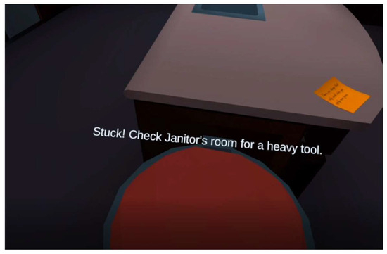 The post-its are presented near the object that players need to interact with, in order to help them find their way. As players find the object and try to interact, a new clue will instruct them on what to do and what tools to use, as Figure 4 shows.