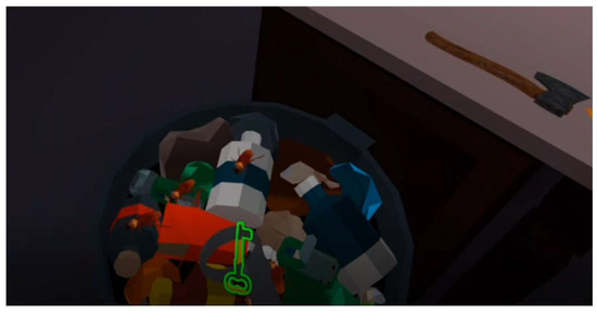 These are all the objects that the player can pick up during the game. Throughout the game planning, we realized what all the objects the player can pick up have in common and what they need to function: picking up, dropping, simulating physics, and occlusion. All grabbable objects have a green outline. This way, the players know the important objects in the game and do not waste time looking for them. Figure 5 shows an example of a grabbable.