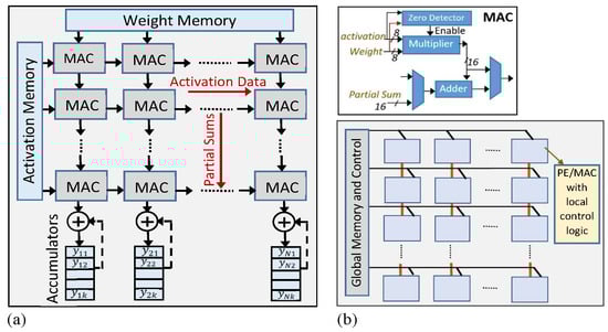 AI accelerator with PE/MAC arrays. (a) Systolic architecture; (b) SIMD architecture.