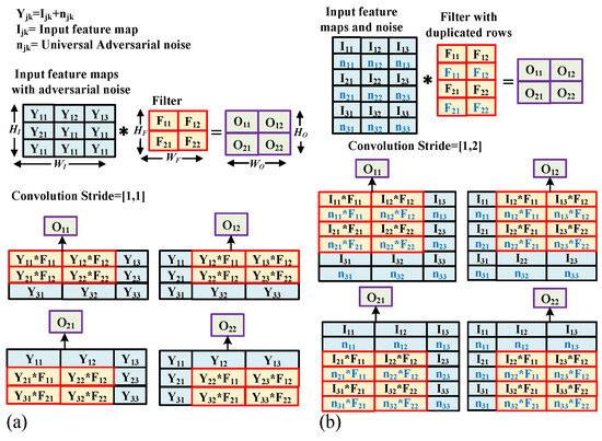 Using the additive property of convolution, the same output feature map can be generated by noise interleaving without directly adding noise to the input. (a) Convolution with direct adversarial noise addition with input; (b) noise interleaved with input, filter duplicated, and vertical stride doubled to accomplish the same task.