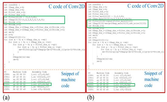To demonstrate the hardware-level adversarial attack on AI/deep learning models based on the interleaved augmentation of universal adversarial perturbation with images (i.e., described in Section 3) on a SoC platform, we used the OpenRISC-based MOR1K soft CPU core with FuseSoC platform [38]. The FuseSoC platform allows writing high-level C and assembly code programs that can be compiled and executed on the MOR1K CPU with other added hardware modules. First, we present the C programming code example of the Conv2D function (i.e., the convolution function used in convolutional neural networks) to demonstrate how input image and adversarial noise data interleaving, filter row duplication, and convolution stride modifications can be accomplished. In Figure 9a, the C code for a regular Conv2D task with is shown. Filter row duplication and interleaving of the adversarial perturbation with an image before feeding it to the Conv2D task is shown in the C code of Figure 9b. After running the MOR1K toolchain [38] under the FuseSoC environment, the C code is converted to equivalent machine code as shown in the snippets in the bottom segments of Figure 9, where it can be seen how the parameter can be altered in the machine code.