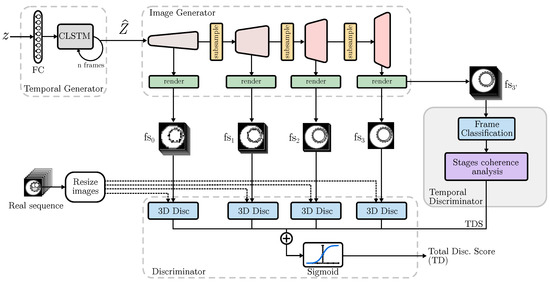The analysis of temporal data using generative models enables various tasks, such as classification, simulation, data augmentation, and generation of missing data [40]. Shi et al. [41] proposed the use of an LSTM block for the analysis of sequences of images and introduced Convolutional LSTM (CLSTM). Instead of working with discrete values, the authors suggested replacing the internal multiplication operations with convolutional operations, thus obtaining output matrices from the CLSTM block of the same size as the input matrices. In the field of biomedicine, the analysis of time sequences is of great interest. Currently, GANs have already demonstrated their viability in tasks such as prediction and diagnosis using textual data [42] and signal data (such as blood pressure and electrocardiograms) [43,44]. For this reason, this study proposes to exploit this capability to apply such models in the generation of image sequences that accurately represent biological development, respecting the order and nature of the stages.