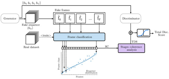 The initial step involves generating a complete video with an image resolution equal to the highest resolution used by the discriminators. To differentiate them, the sequence used by the TD is denoted as , while the one used by the final classical discriminator is named , with D representing the total number of 3D discriminators. TD employs a image classifier to categorize each frame of the video. This classifier is pre-trained using the real dataset. In cases where the dataset already has its own classification, that information is used. However, if the dataset lacks prior classification, a fictitious division is employed. This involves assuming that in a video with F frames, frame corresponds to class 0, frame to class 1, and frame to class F. This classification can be modified by grouping frames to reduce the number of classes. This topic is further discussed in Section 4.
