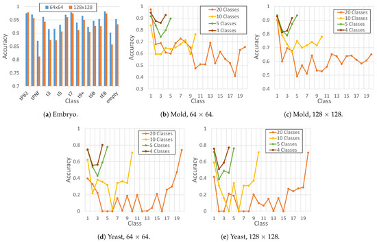 Classification accuracy of ResNet18 for each dataset (Embryo, Mold, and yeast). The tested image sizes used in this experiments are 64 × 64 and 128 × 128. Lastly, the number of classes of the Embryo dataset was predefined as 17 (from tPB2 to empty); the tested number of clases for the Mold and Yeast datasets were 4, 5, 10, and 20. This way, different groupings were tested, where each group contained the same number of frames.