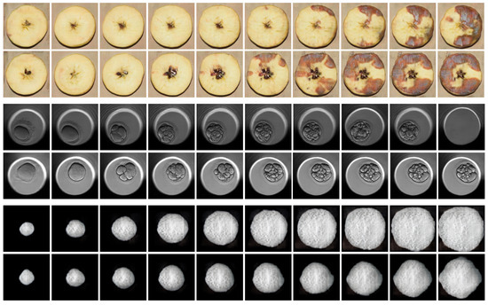 The second dataset is a custom collection of mold development videos [48]. It shows the development over time of Golden Delicious apples cut side by side, which we will refer to as Mold. A photograph was taken every 12 h for 10 days, yielding 20 images for each. In total, the development of 144 apple halves was captured for a total of 2880 images. Images were taken using a Nikon D5300 and an AF-P 18–55 mm lens every 12 h for 10 days. The apples were stored in groups of 6 in different containers, resulting in original images of 2992 × 2000 pixels at 300 ppp. Subsequently, the photography with a group of apples was automatically split to obtain individual images of 997 × 1000 resolution. When selecting the videos, those with problems, such as a lack of focus or lighting, were excluded. Each frame was accompanied by the exact position of the apple in the image, thus forming a bounding box composed of 4 dimensions: xPos, yPos, width, and height. The xPos and yPos values indicate where the center of the bounding box is with respect to point (0,0) in the top left-hand corner. They are calculated by dividing the position of point and by the width and height of the original image respectively.