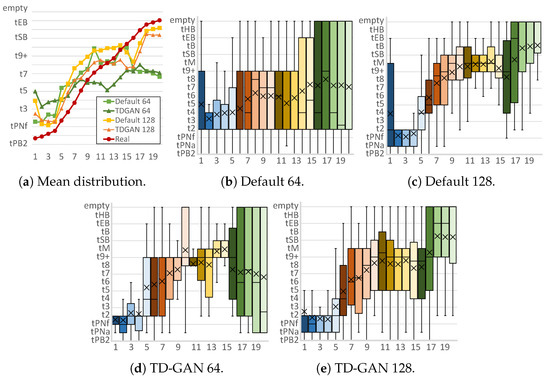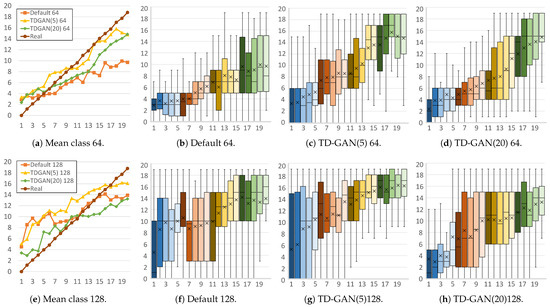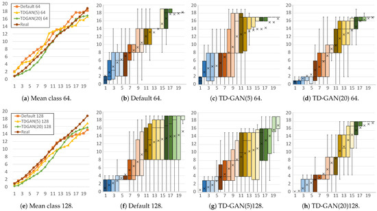Finally, Figure 7 shows the distributions of the yeast dataset. For both sizes, the mean distributions are very similar, giving good results even with the default model. However, in the case of 64 × 64 images, as shown in Figure 7b–d, the default model generates a large number of incorrect stages in the first part of the video. Using 20 classes with TD-GAN improves this situation by achieving a growing distribution in which the first frames contains only initial stages.