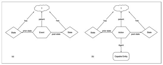 Figure 1 illustrates the modeling of event and action in CPT, adapting the TypeDB icon for relation. TypeBD represents a relation as a diamond. CPT uses this icon to represent static relations, but stretches it into a regular hexagon to distinguish the event relation as well as its subtypes. The diagrams of event and action, a and b, in Figure 1, are identical except that the action model includes an agent. An event involves a change from a prior state to a post state. Their difference depends on what happens in the event. What happens depends on the patient affected by the event. Patient is depicted as a cloud labeled “?”. This is undefined—and the cloud is not a TypeDB icon—because patient is a sum type that could be any of various types depending on the situation. It might be an entity when the event is a change in a single attribute, such as a change in the temperature of a cup of tea. The patient could also be a relation, such as the location of a car on a road or a change in status of a person from job applicant to employee. The patient could also be a complex state of affairs where the change from prior to post state could involve the creation of new entities or the termination of existing ones, as in corporate mergers and dissolutions.