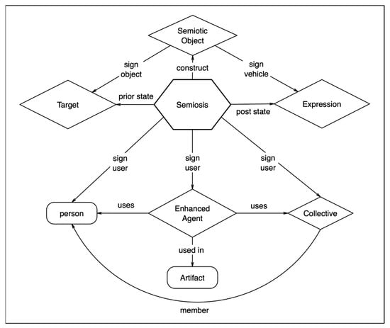 What, then, is semiosis? Consistent with the objective of neutrality, CPT does not choose among the various conceptions of sign, with one notable exception. Qualifying interpretant as a mental state or semiosis as a mental process or habit is out of scope for CPT because we do not have adequate and, in most cases, any access to past mental states. Apart from that, modeling semiosis as a function type allows variations to be represented as different subtypes. This approach serves the basic purpose of CPT because semiosis in this model readily maps to the various uses of ‘mediation’ in the social sciences [,,,]. However, the elaboration of subtypes of semiosis is left for future development.