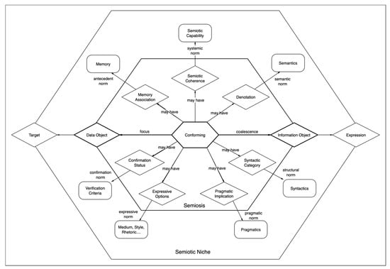 Each type of element determines different types of norms, and an intelligent agent specifically determines what types of norms to apply in a given instance of conforming. Specification and tailoring occur within the agent’s semiotic scaffolding. Hence, Figure 3 includes within the scaffolding relations that link the conforming process to each of the normative elements in the semiotic niche. The denotation of an information object is determined when the agent applies semantic norms. The syntactic category applies structural norms that assign an information object to a set that specifies possible formal relations with other sign vehicles. Syntactics is not limited to language but includes anything that guides the combinations and ordering of any type of information, such as a database schema or the depiction of objects in perspective paintings [].
