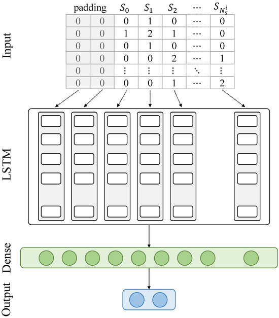 To identify whether a subject has dementia or is a control subject, we use an LSTM neural network, which we train for classification. However, to train such a network, the data need to be standardized first. The data acquired from the previous steps result in matrices of different sizes for each subject. While the number of topics is the same throughout the entire process, each subject describes the image in their own way. This means that some would briefly describe it while others describe it in more detail. This makes the dimension specifying the number of sentences differ from one subject to another (and it is, therefore, referred to as where i is the index of the subject in the data set. To address this issue, we pad the data to the highest number of sentences in our data set. The padding is performed at the beginning of the matrix, meaning that we assume that a certain number of empty sentences preceded the subject’s speech. This results, finally, in a set of equal matrices of size , where is the longest image description in the data set.